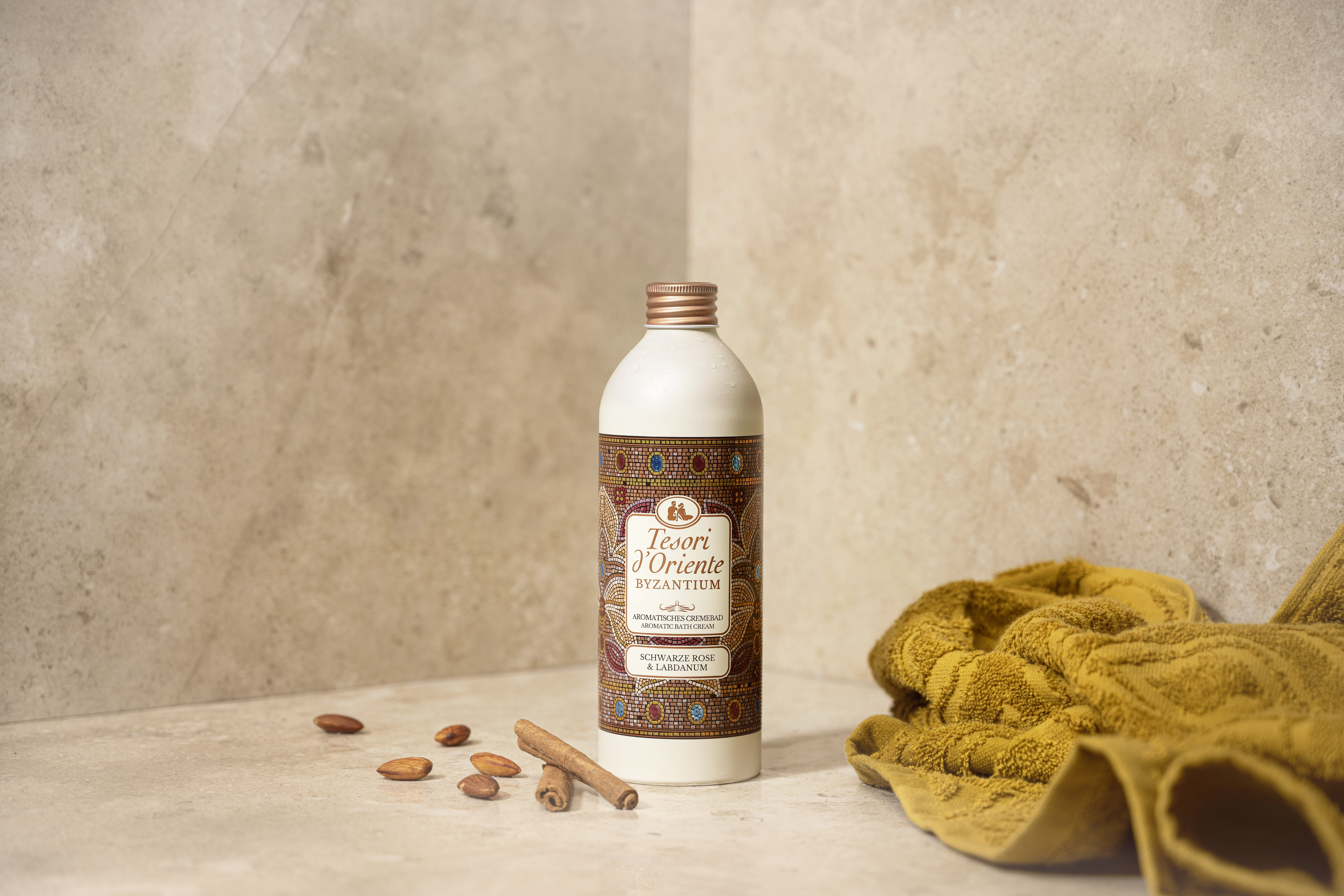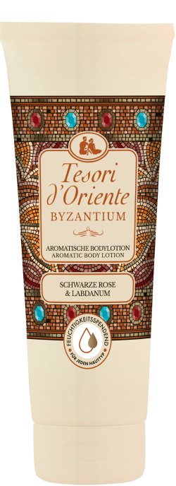 Inspiriert von der geheimnisvollen Stadt Byzanz verwendet Tesori d’Oriente wertvolle Inhaltsstoffe, darunter schwarze Rose und Labdanum. Das edle und aromatische Labdanum wird aus der kretischen Zistrose gewonnen und wurde einst als beliebtes Schönheitsritual der byzantinischen Frauen nach dem Bad verwendet. Das Ergebnis sind langanhaltende, sanft pflegende und sinnlich duftende Produkte in einer edlen Optik.